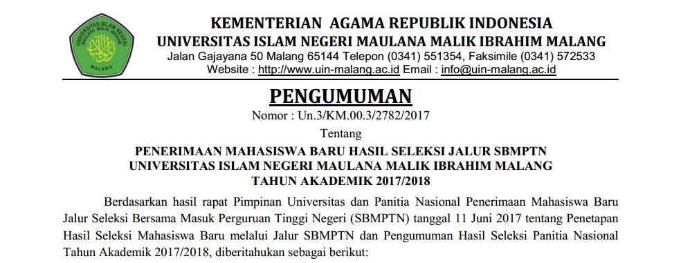 PENERIMAAN MAHASISWA BARU JALUR SBMPTN UIN MAULANA MALIK IBRAHIM MALANG TAHUN AKADEMIK 2017/2018